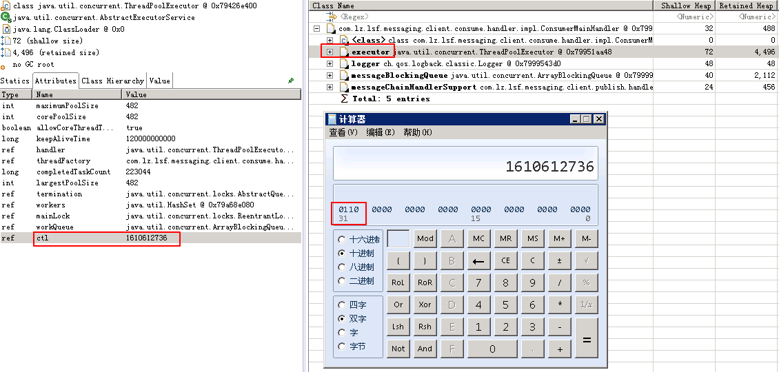 jmap -dump命令dump出堆快照,使用MAT工具分析,结合代码找到线程池对象,其状态如下图所示,可以看到线程池已经处于TERMINATED状态。