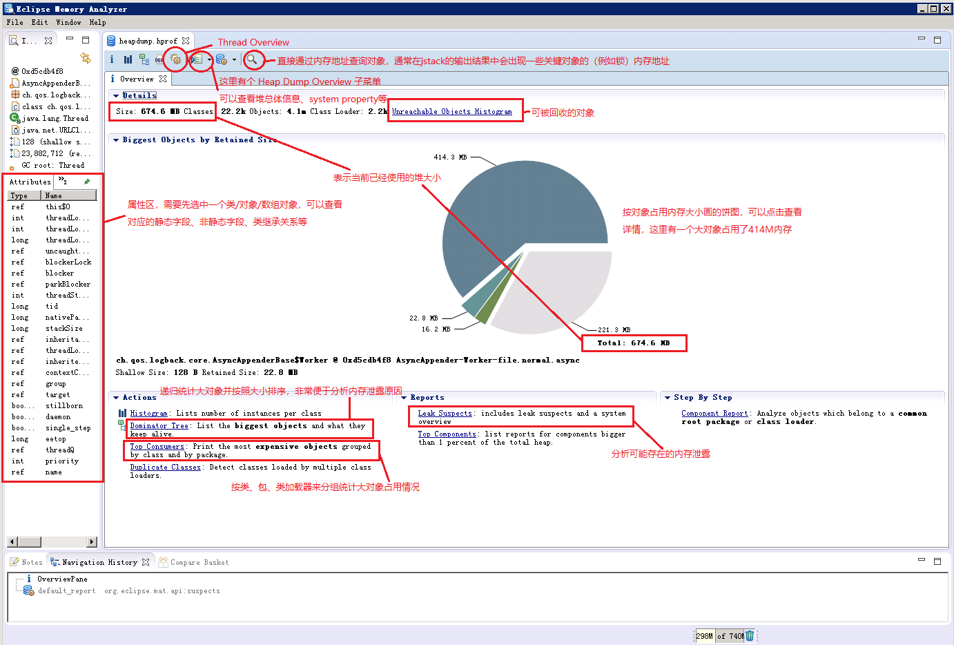 - Leak Suspects:分析可能存在的内存泄露问题,其实跟Dominator Tree的分析结果差不多