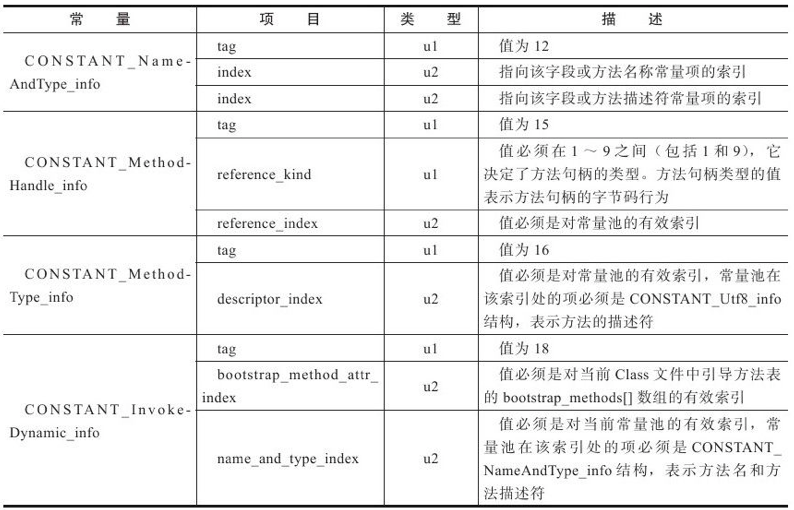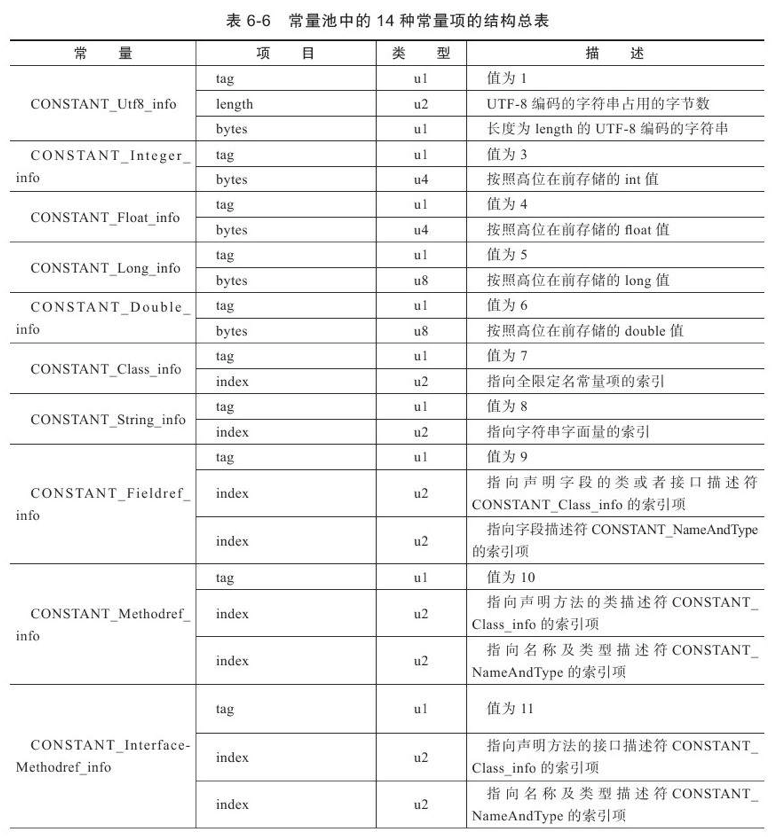 | cp_info | constant_pool | 长度是constant_pool_count-1,主要存放字面量和符号引用 |