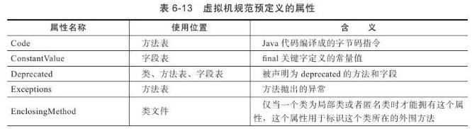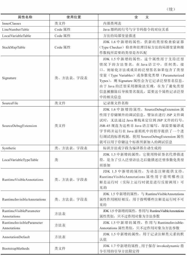 在类、字段、和方法中都会引用属性表,Java虚拟机规范第7版中预定义了21种属性表。常用的属性表如下: