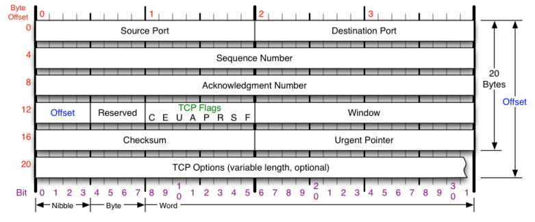 - Offset 偏移量,该字段指定了TCP头部会有几个32 Bits的Word组成,取值范围[5,15],即TCP头部长度在20 Bytes ~ 60 Bytes 之间