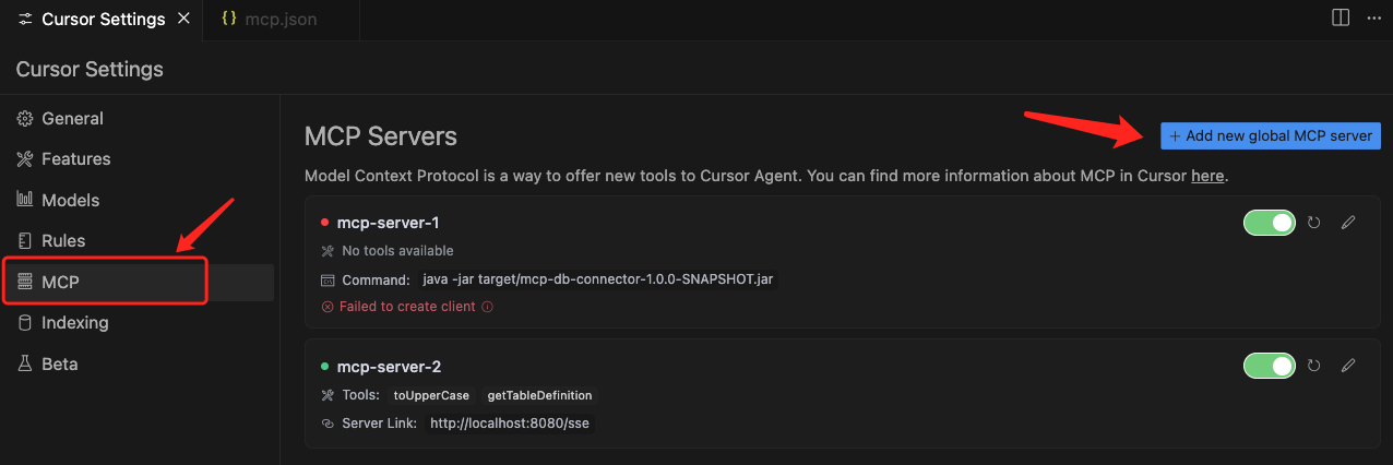 我们尝试在Cursor中验证一下效果,首先需要配置MCP Server