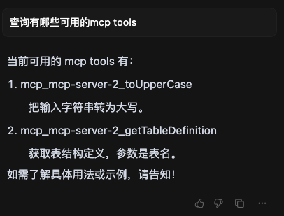 }这时可以询问Cursor有哪些可用的MCP Tools,这里也可以直接用命令show tools:
