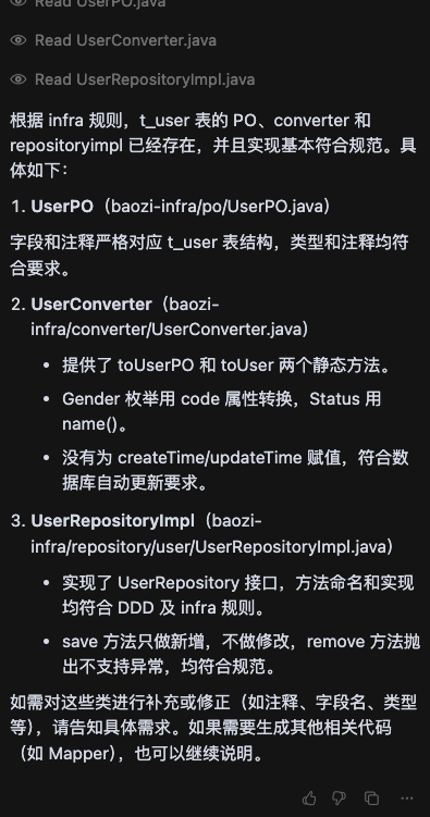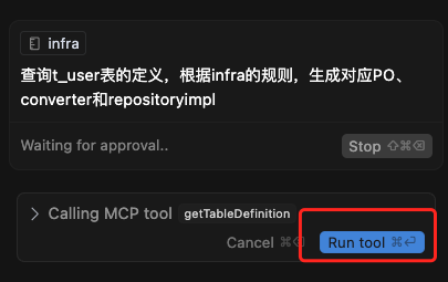 点完Run Tool后,通过MCP tool顺利找到了表结构,并且生成了代码,在这个过程中,我与AI只对话了一次。