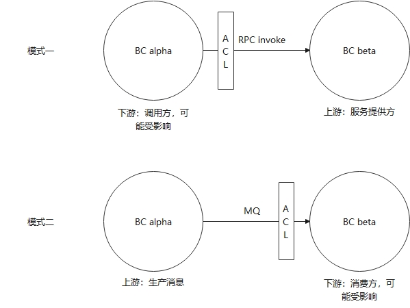 还有一类较常见的模式,两个BC之间有共享的部分,叫做共享内核(Shared Kernel)。这种情况下可以把共享内核抽出来单独做一个小型的BC,为啥要小型呢?因为这种模式存在一定风险,共享内核的修改会影响多个下游。