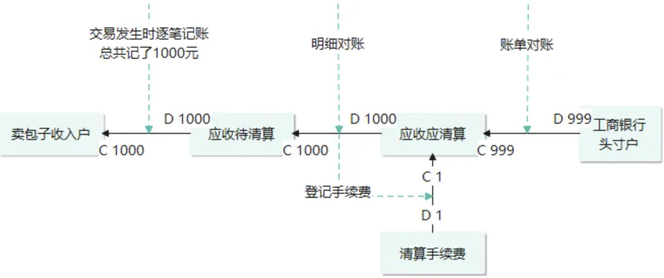 假设清算机构每1000元要收1元,这里可以通过登账的方式记录手续费金额