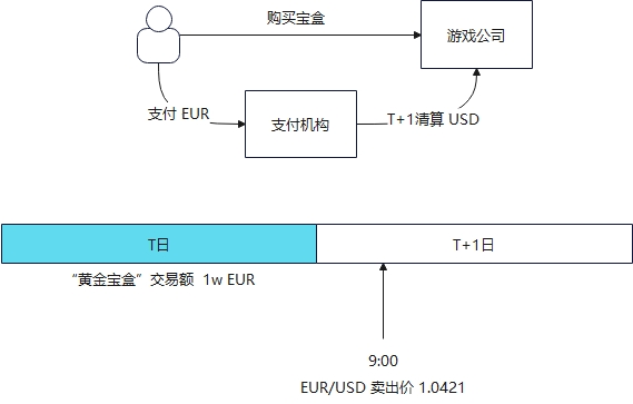 T日结束后,支付机构就可以开始进行清算,计算出这一日的交易总额是10000EUR,在T+1 9:00以市价兑换成USD,在不计其他费用的情况下,游戏公司能收到 10000*1.0421 = 10421 USD