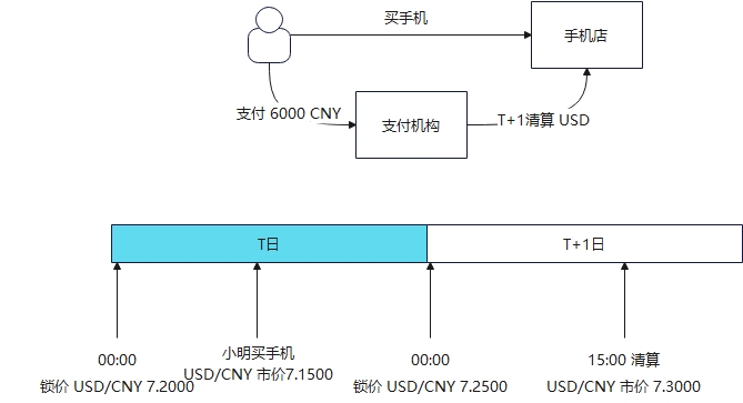 小明买手机时支付6000 CNY,手机店应该收到6000/7.15=839.16 USD,到了T+1 15:00清算时,市价发生了变化,这时6000CNY可以兑换到6000/7.3=821.92USD,可以兑到的美元变少了,商家不愿意承担损失,支付机构需要亏损839.16-821.92=17.24USD补贴给商家如果进行锁价: