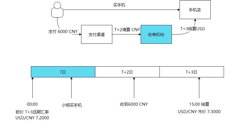 远期交易的汇率不确定性会更高,因此往往会采用锁价方式。应用场景举例:还是上面的例子,小明到国外旅游并买手机,但由于支付渠道T+2才能完成CNY清算,收单机构与商家约定T+3进行USD结算。