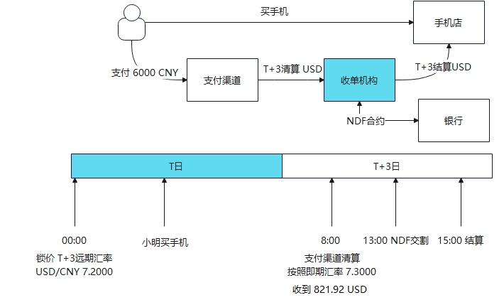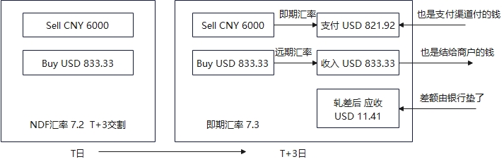 - 收单机构与银行签订了NDF合约,本应支付6000 CNY,改为按照即期汇率支付821.92 USD