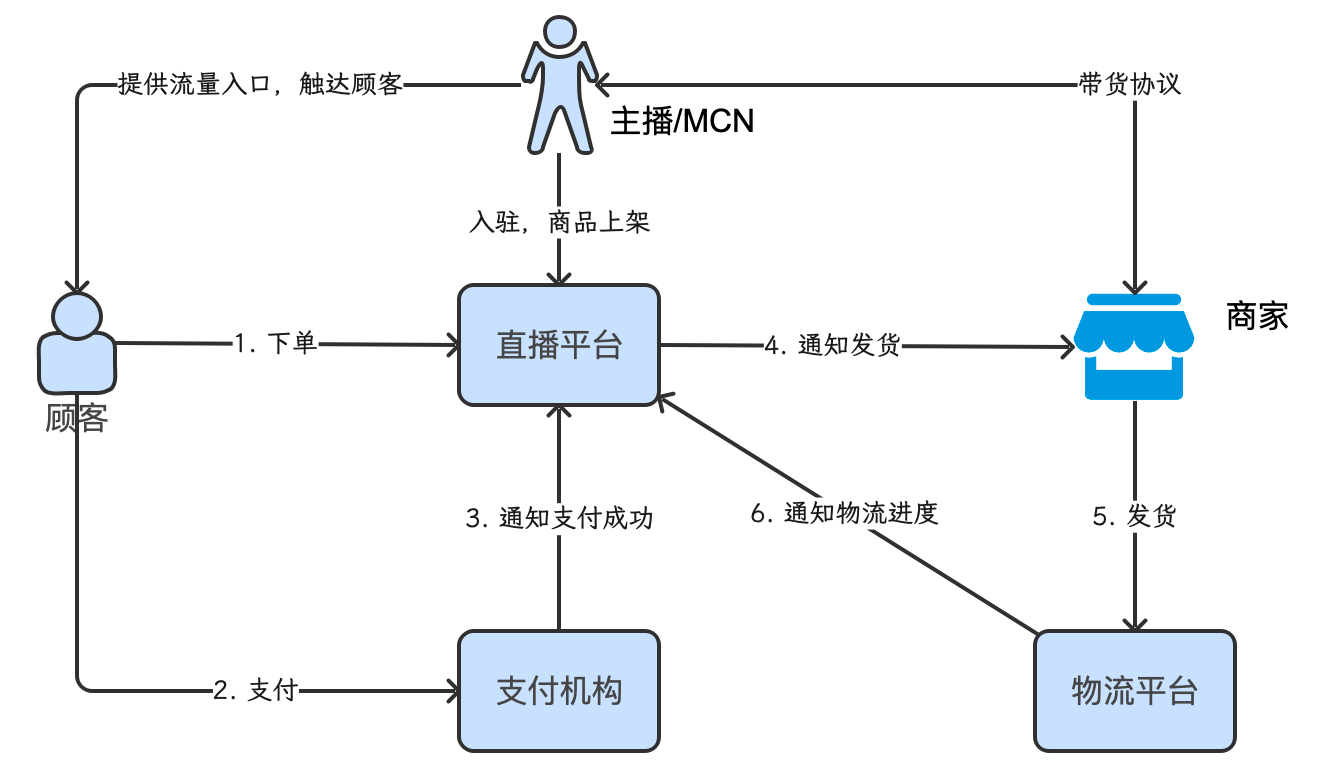 举一个直播电商的例子,各参与方关系如下,其中直播平台和支付机构属于两家不同公司,或在一家公司中的两个不同部门。