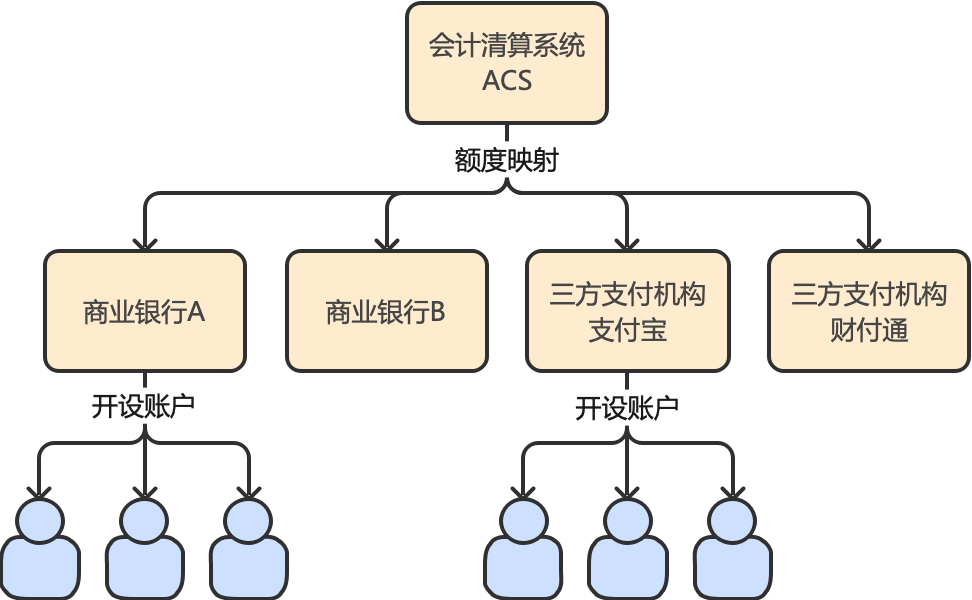 支付宝在这里的角色是 第三方支付机构,与银行一样,都是人民币清算体系的参与者。不论用户把钱存在银行还是存放在支付宝,最终都是由央行在监管,映射为ACS中的一部分额度。当然实际上还是有细微区别:支付宝毕竟不是真银行,不能做储蓄业务,也就不能产生利息。但如果我们只从资金存放的角度看,银行和支付宝都是“可以存钱的地方”,存的是人民币,与稳定币毫无关系。